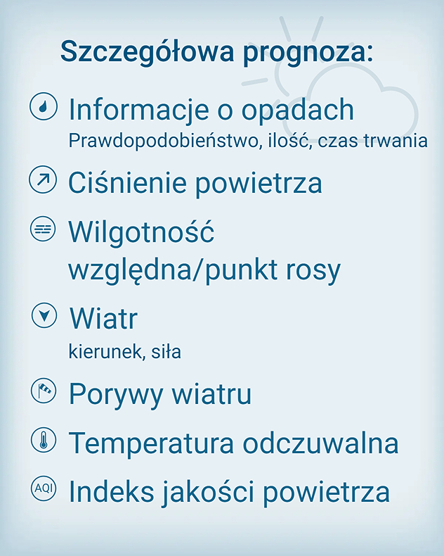 Nasza precyzyjna prognoza pogody zawiera szczegółowe informacje na temat usłonecznienia, wiatru i opadów w Twojej lokalizacji lub dowolnym miejscu na świecie.