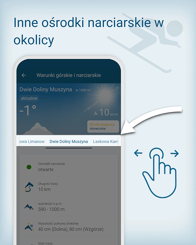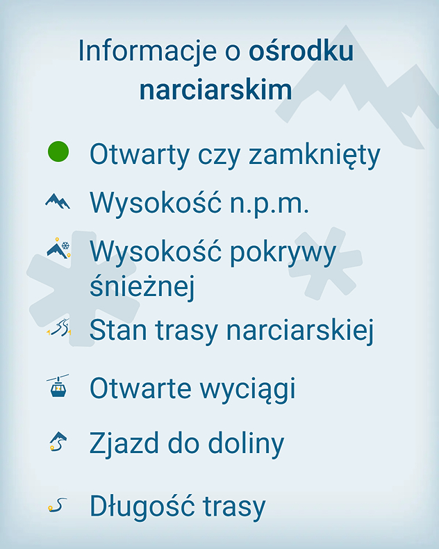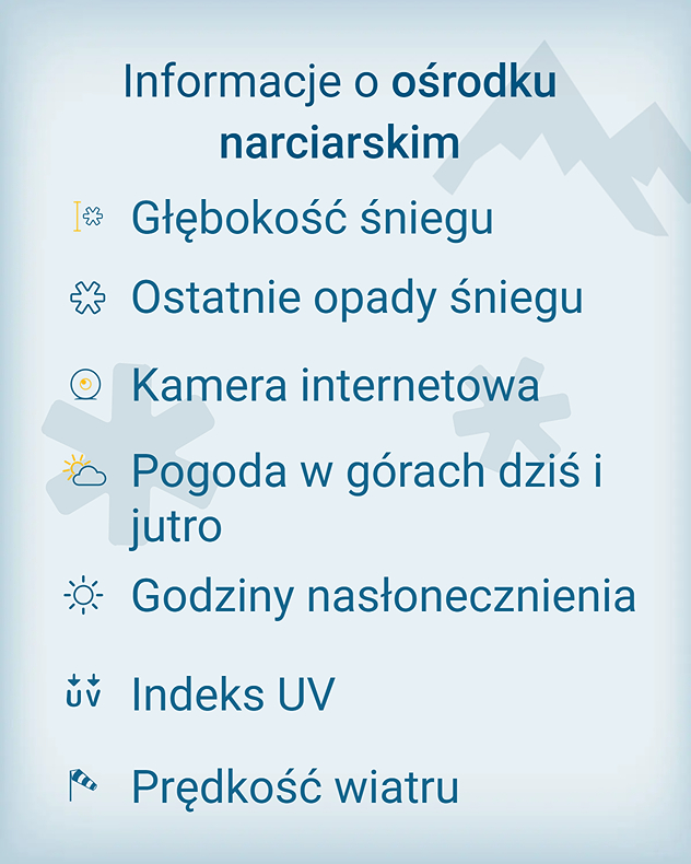 Jeśli chcesz wiedzieć, czy warto spakować sprzęt narciarski, znajdziesz tu wszystkie ważne informacje o najbliższym ośrodku narciarskim, a także o głębokości śniegu w dolinie i na stoku, przedstawione w przejrzysty i zwięzły sposób.