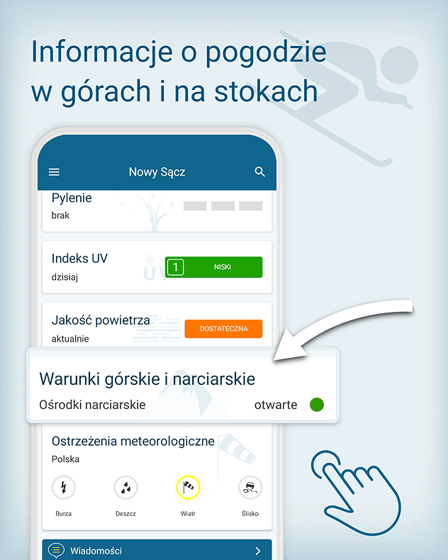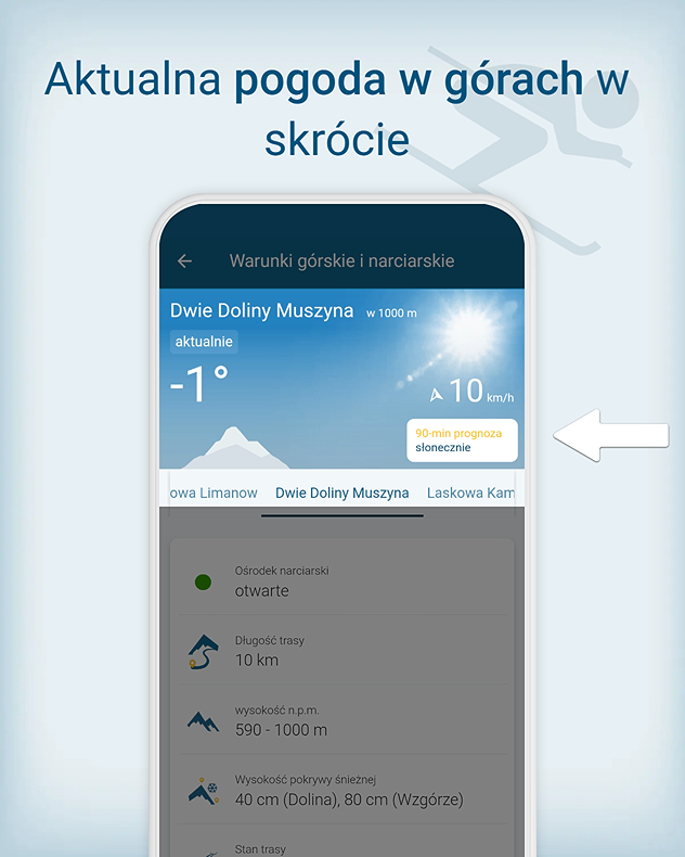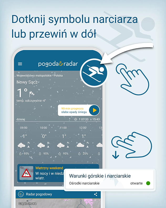 Dla wszystkich miłośników śniegu aplikacja Pogoda & Radar z radarem pogodowym jest równie niezbędna zimą. Nasza prognoza pogody w górach i na stokach narciarskich to wyjątkowa usługa.