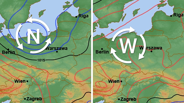 W poniedziałek nad Polską przejdzie niż (po lewej), a we wtorek nadejdzie wyż (po prawej).