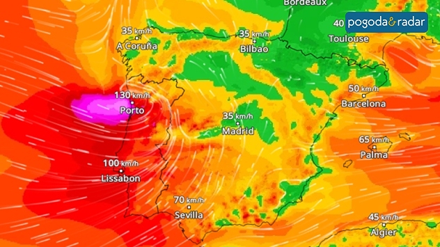 W ciągu dnia niż baryczny przesunie się nad Hiszpanię, gdzie wiatr również znacznie się wzmocni. W głębi lądu będzie wiał z prędkością do 80 km/h, z porywami do 110 km/h w wyższych partiach gór.