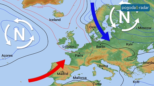 Układ niskiego ciśnienia znad północno-zachodniej Rosji ściąga zimne powietrze arktyczne na południe, w kierunku Polski. Kolejny niż znad Atlantyku sprowadza ciepłe powietrze od strony Hiszpanii.