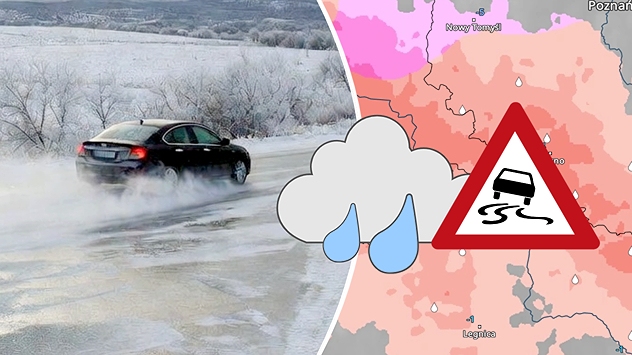 Po lewej stronie zamarznięte jezioro pokryte śniegiem i lodem, a w tle płaskie brzegi. Po prawej stronie mapa temperatur Węgier pokazująca bardzo niskie temperatury poniżej zera.