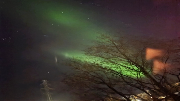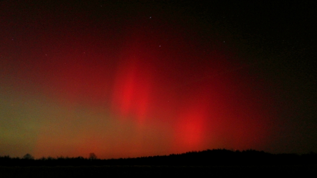 Nisko nad horyzontem zorza mieniła się kolorem zielonym, powyżej czerwonym, a jeszcze wyżej, niemal w zenicie, widoczne były intensywnie zielone wyspy wyglądające jak falbanki. Nie zabrakło też filarów.