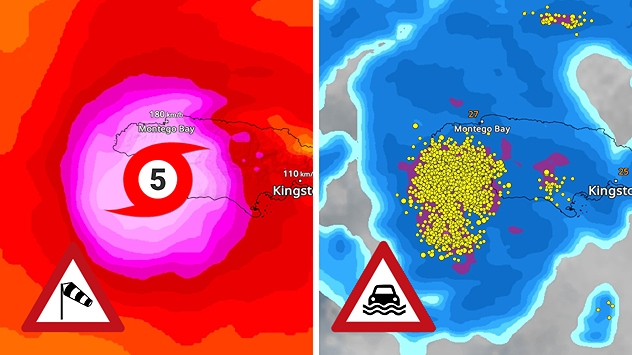 Huragan Melissa nad Jamajką widoczny na Radarze Wiatru (po lewej) i na Radarze Pogodowym (po prawej).
