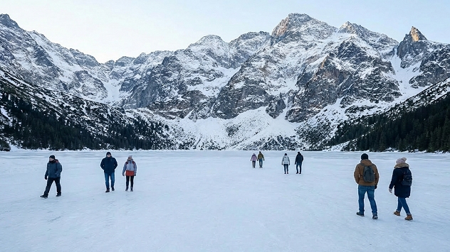 TOPR-owcy ostrzegają turystów, aby nie wchodzili na taflę lodu pokrywającą Morskie Oko w Tatrach, ponieważ jest bardzo cienka.