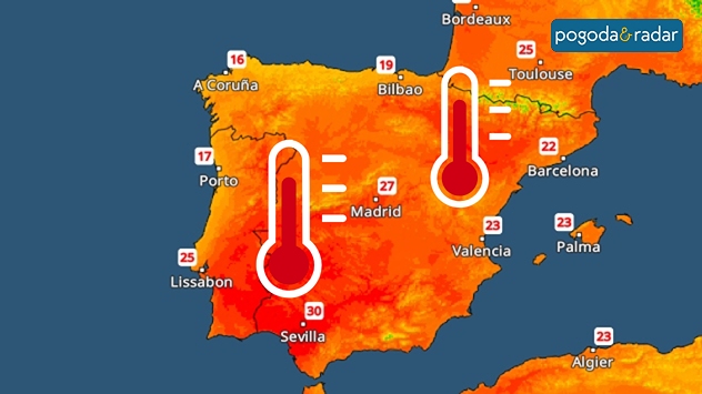Radar Tempeatury pokazuje pierwsze bardzo gorące dni w południowo-zachodniej Europie.